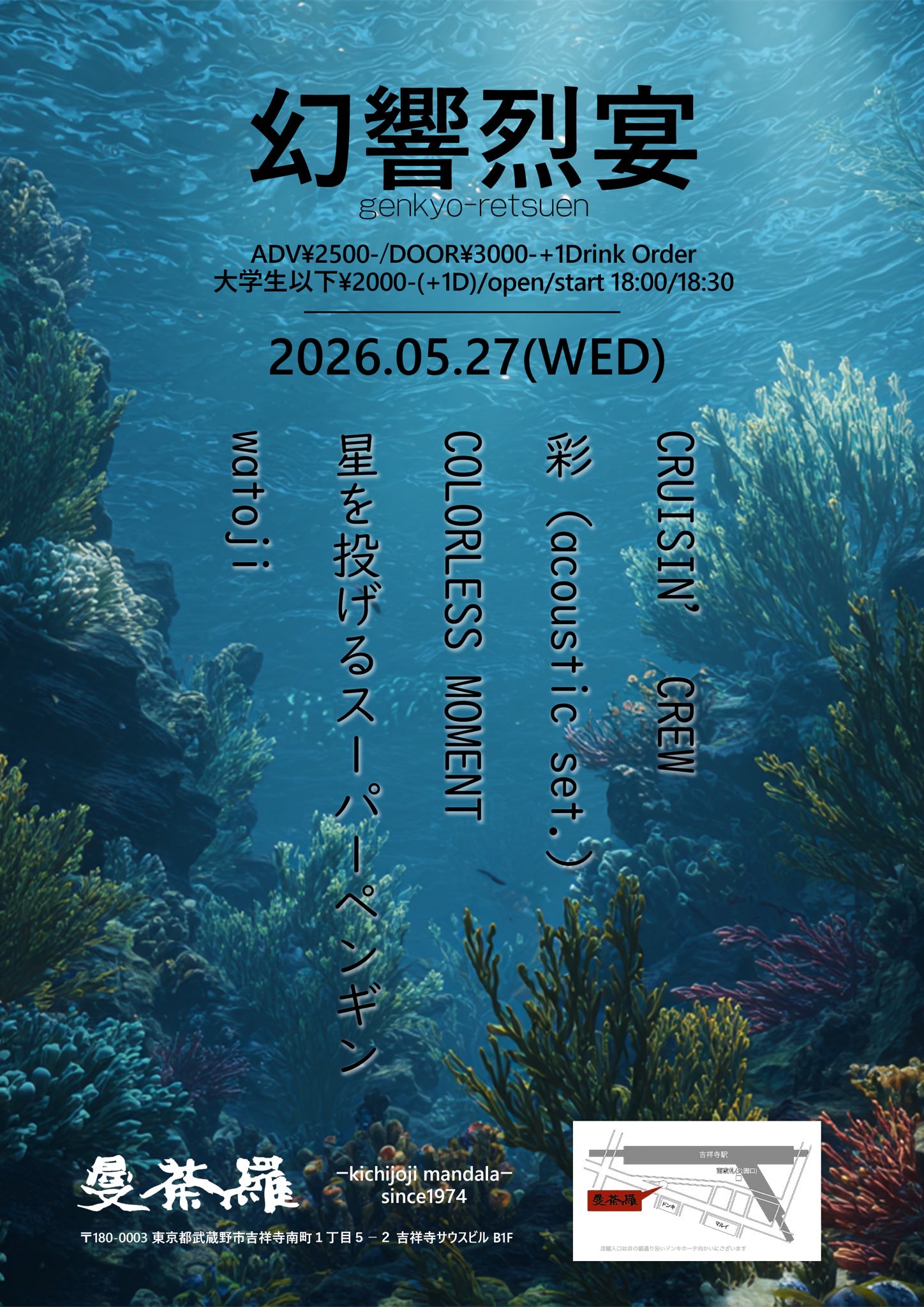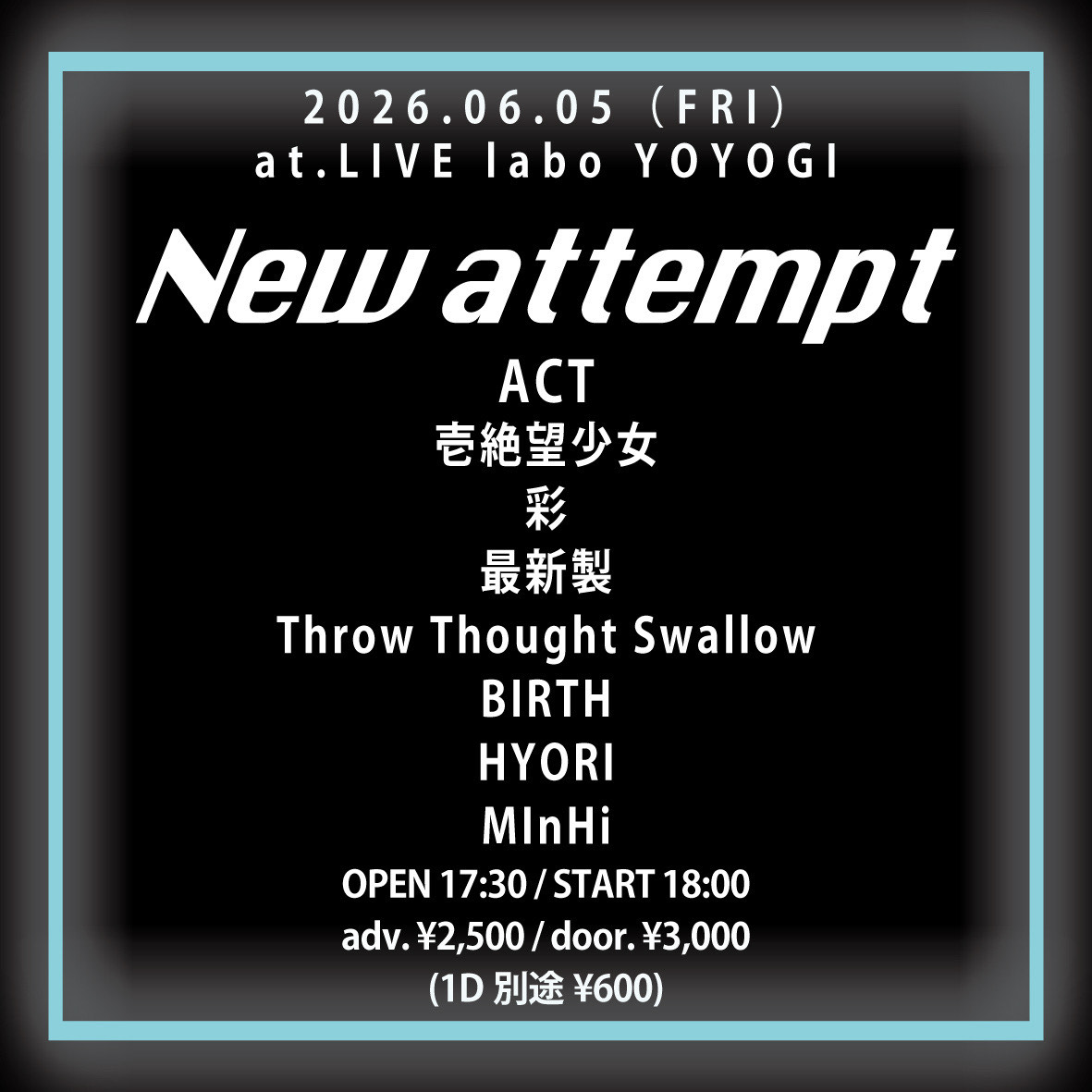 2026/5/6(Wed)@Youtube Live 2026/5/14(Thu)都内某所 2026/5/27(Wed)@吉祥寺曼荼羅 地図 ◼︎OPEN/START 18:00/18:30 ◼︎Charge adv: ¥2500 door: ¥3000(+1D) 彩(出演時間:未定~)/CRUISIN’ CREW/OLORLESS MOMENT/watoji/星を投げるスーパーペンギン ※高校生以下¥2000-(+1D) 2026/6/5(Fri)@代々木labo 地図 ◼︎OPEN/START 17:30/18:00 ◼︎Charge adv: ¥2500 door: ¥3000(+1D) 彩(出演時間:未定~)/壱絶望少女/最新製/Throw Thought Swallow/BIRTH/HYORI/MInHi 2026/6/19(Fri)都内某所 チケットのご予約はCONTACTより、希望日程とお名前、枚数を記載の上ご連絡ください。